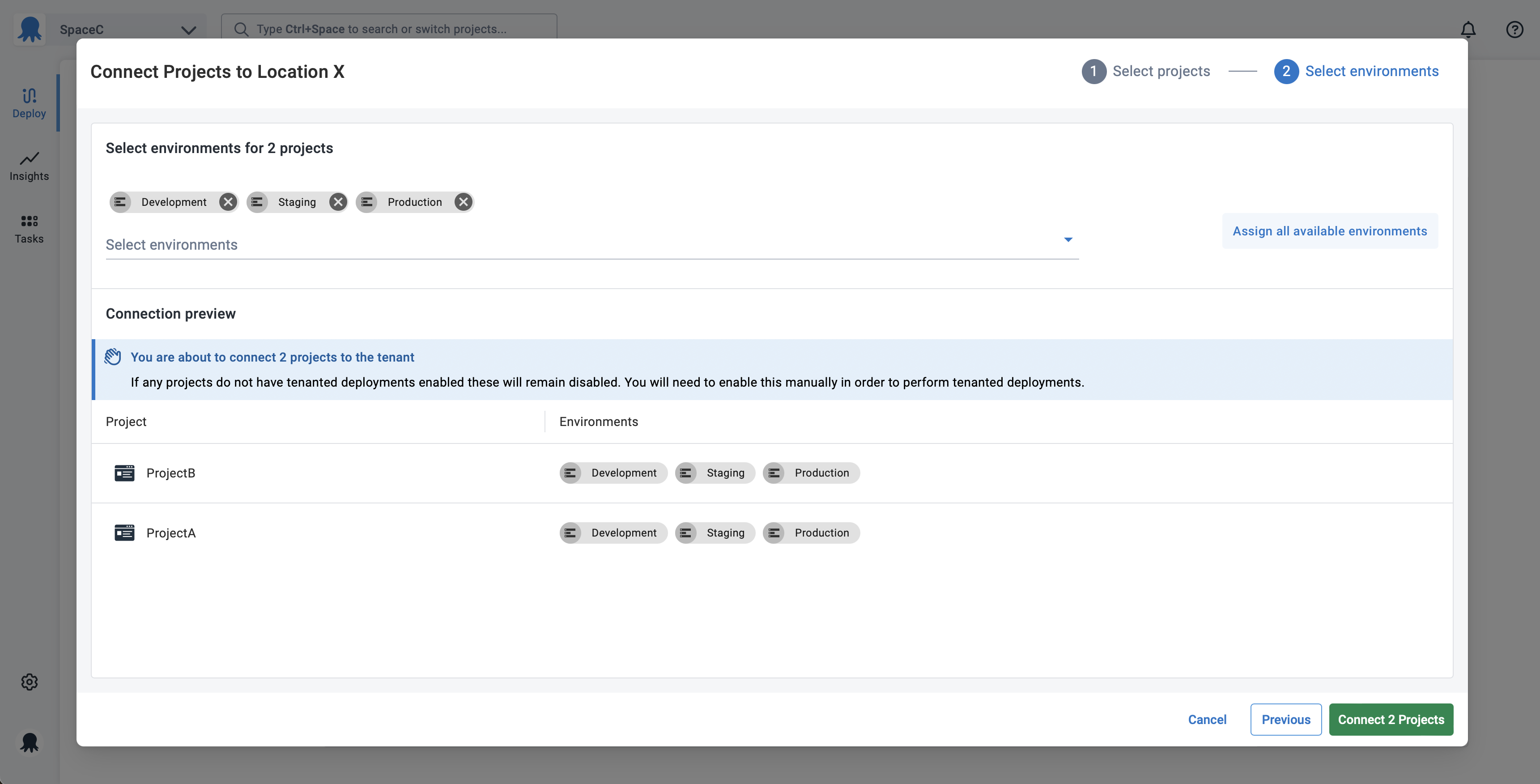 Choose the environments you want the tenant to be connected to for each project. You can select just one or two from the drop-down menu, or click Assign all available environments to select all available environments.