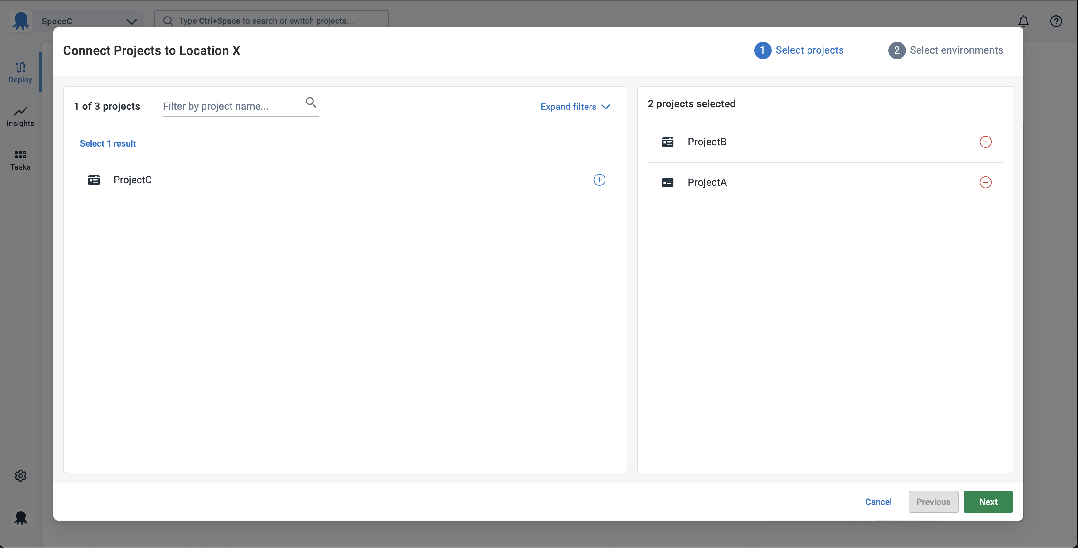 Choose the projects you want to connect to your tenant, by clicking any project in the left-hand panel of the wizard. Click the - button of a project in the right-hand panel to deselect that project.